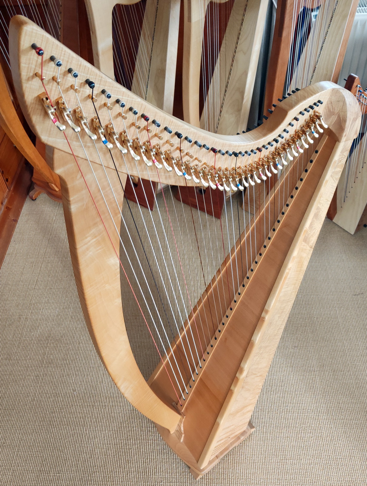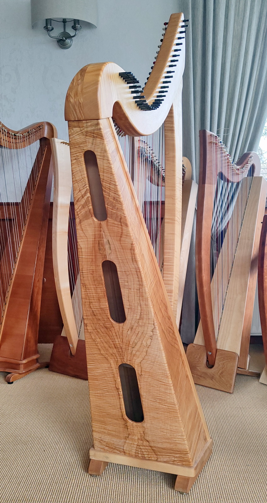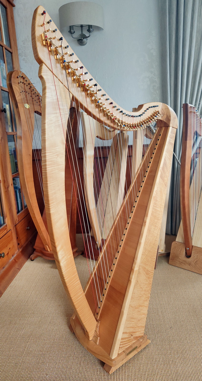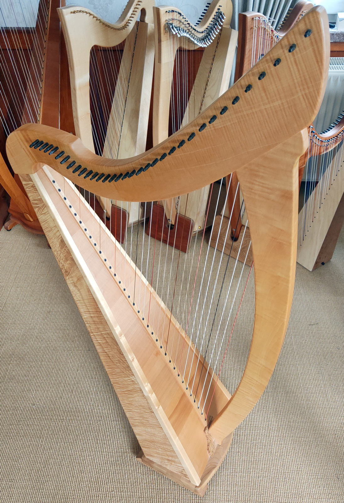 Diese charaktervolle Harfe ist 7 Jahre alt. Gefertigt in der Harfenbauwerkstatt von Henrik Schupp in Hamburg aus besonders lebhaft gemaserten und ausdruckvollem Bergahorn. Vor 4 Jahren wurde die Besaitung auf einen weicheren Klang hin optimiert und vollständig erneuert.
